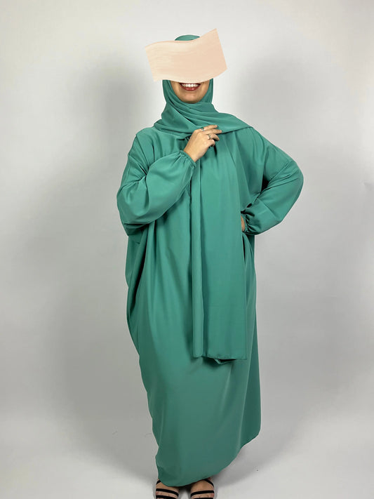 ABAYA SOIE DE MEDINE HIJAB INTEGRE VERT D'EAU